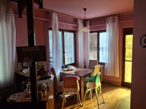 Eltolt szintes, négy szoba található a földszinten és két szoba az emeleten, egy fürdőszoba, két különálló WC és tárolóhelyiség, nagy étkezős konyhával, erkéllyel és egy terasszal.